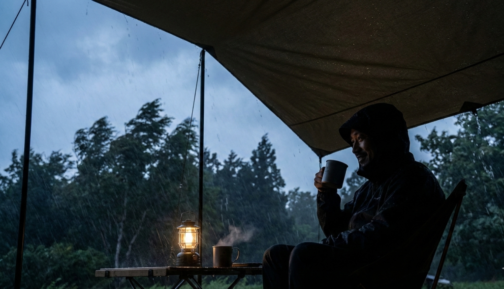 - 「雨音ハイボール」を楽しむ:タープを叩く雨音をツマミに、ちょっと高いウイスキーを飲む。これが究極の贅沢。